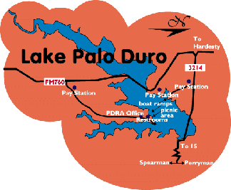 SPEARMAN--One of the best kept secrets in the Texas Panhandle lies nestled in the breaks of Horse Creek and Palo Duro Creek about 8 miles South of Spearman, in Hansford County. Go to Spearman, about 90 miles Northeast of Amarillo, and drive North on FM760. 5 miles down the road, the flat land begins to break, and the view gets better and better and better until Lake Palo Duro springs into sight. "This is the first time for me to come here. I really don't know how the fishing is," said Murray Arrington of Amarillo, as he cast his spinner into the water from a bait casting rig. "I hear the blue cats are doing good. "To know a lake, you've got to fish it as much as possible." However, Arrington did have an observation..."I really like the structure of the lake, there are trees in the water and a lot of things you like to see." Retired oilwell driller, Bob Wray, and his buddy Joe Brackeen, a retired roughneck, both 70 and from Perryton, parked their pickup and ambled to the bank. Wray said the duo has fished the lake since it started. "That was 1993," said Jim Derington, Palo Duro River Authority GM. Construction on the dam began in 1991. Wray said the lake features great fishing. "We've caught some nice catfish here, " he said. "I've had 45 pound test lines broken more than once." Wray also said crappie fishing time is looming. "Right now's a pretty good time to start and we've got some pretty good walleye too." There have been some 4-5 pounders caught before. |